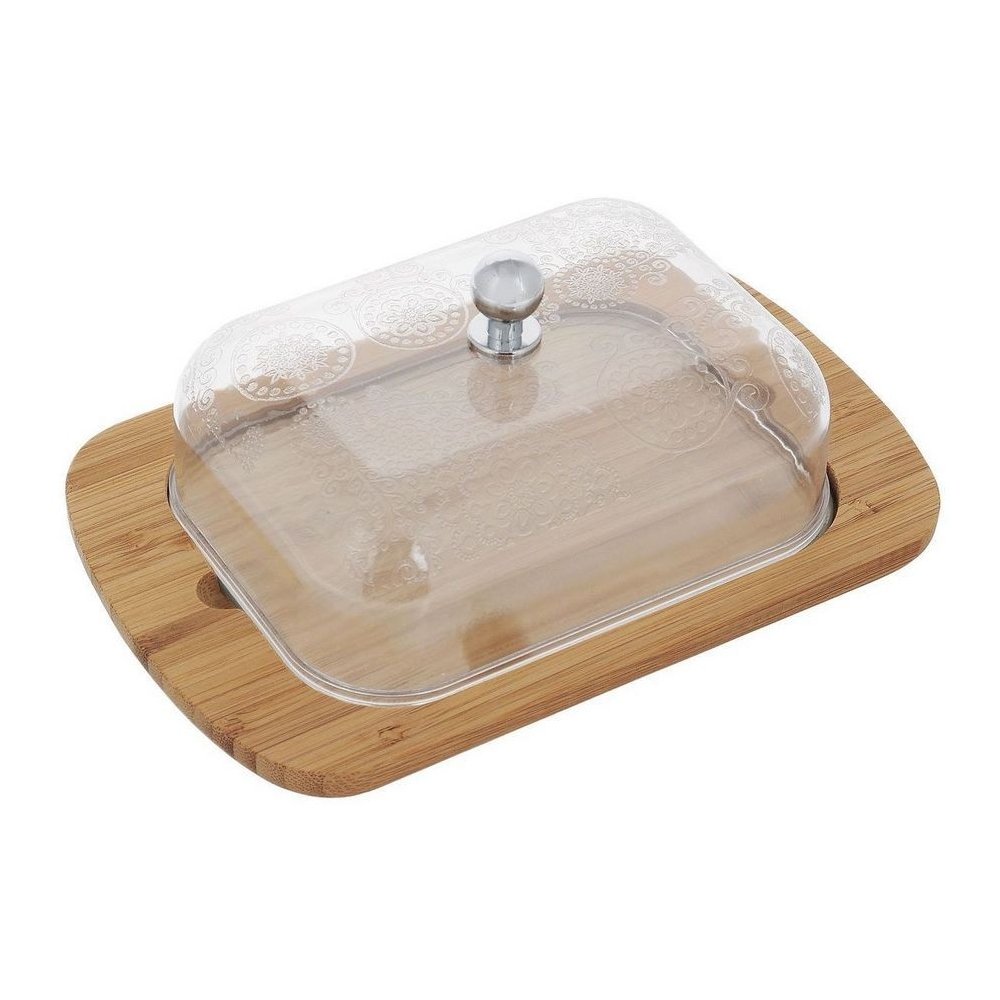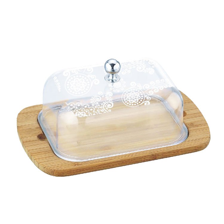 - Rectangular bamboo base and transparent plastic lid with patterned design